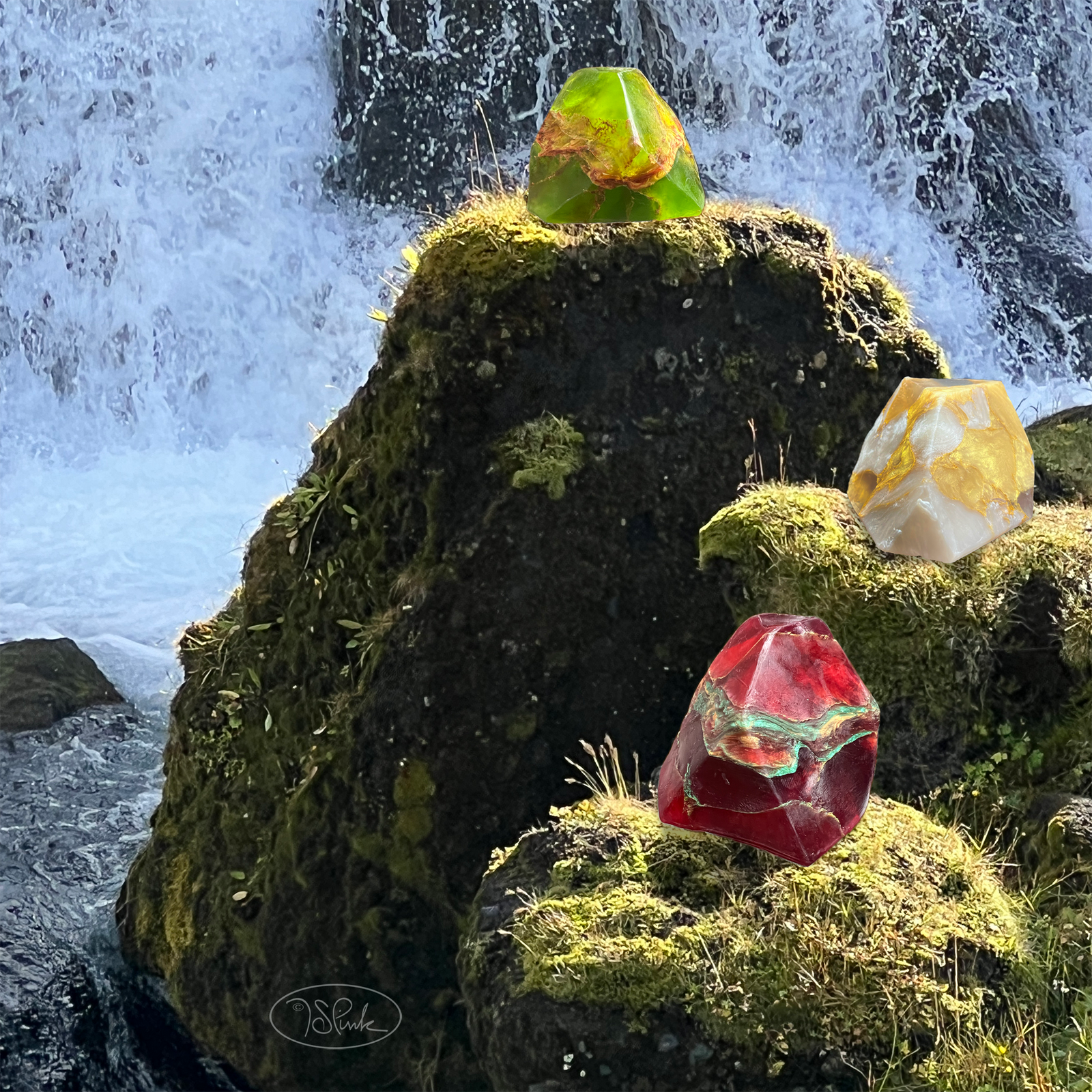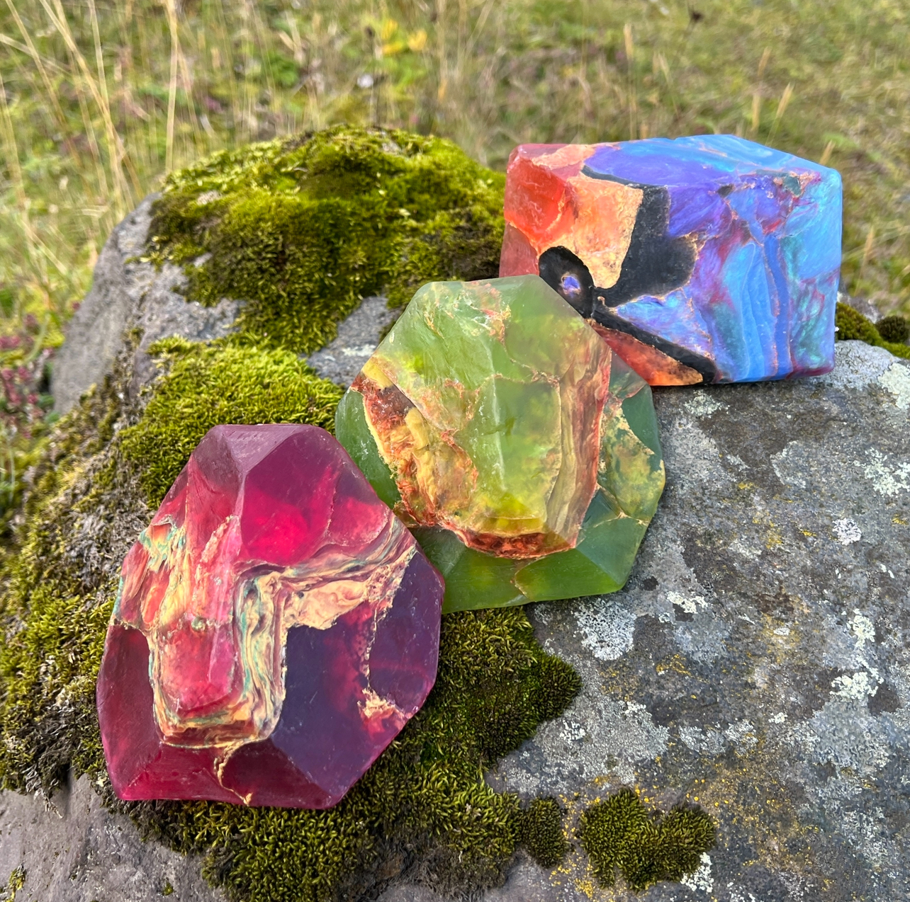 SoapRocks® are known, not just for their visual beauty, but even more for their exceptional washing qualities. Endowed with sustainably-sourced, organic oils and extracts of earth including: Organic Aloe, Organic Calendula, Organic Chamomile, Organic Lavender, Vitamin E, Organic Jojoba Oil, Organic Olive Oil, Organic Almond Oil, they are a hybrid dense vegan glycerin soap that is designed to cleanse while preserving your skin's natural oils.